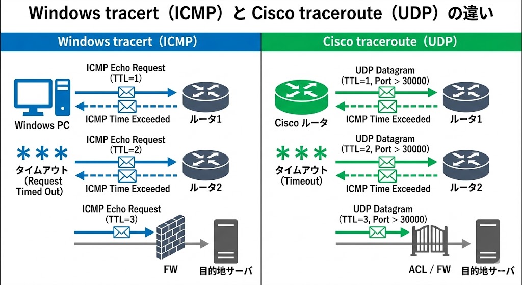 tracertは ICMP、Ciscoのtracerouteは UDP(デフォルト) で動く - FW / ACL / NAT の設定により、OSや機器ごとに結果が変わるのは普通