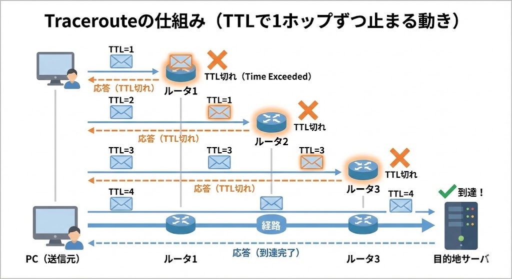 こうして、1ホップずつ“寿命切れ”させながら経路を洗い出すのがtracerouteの基本動きです。